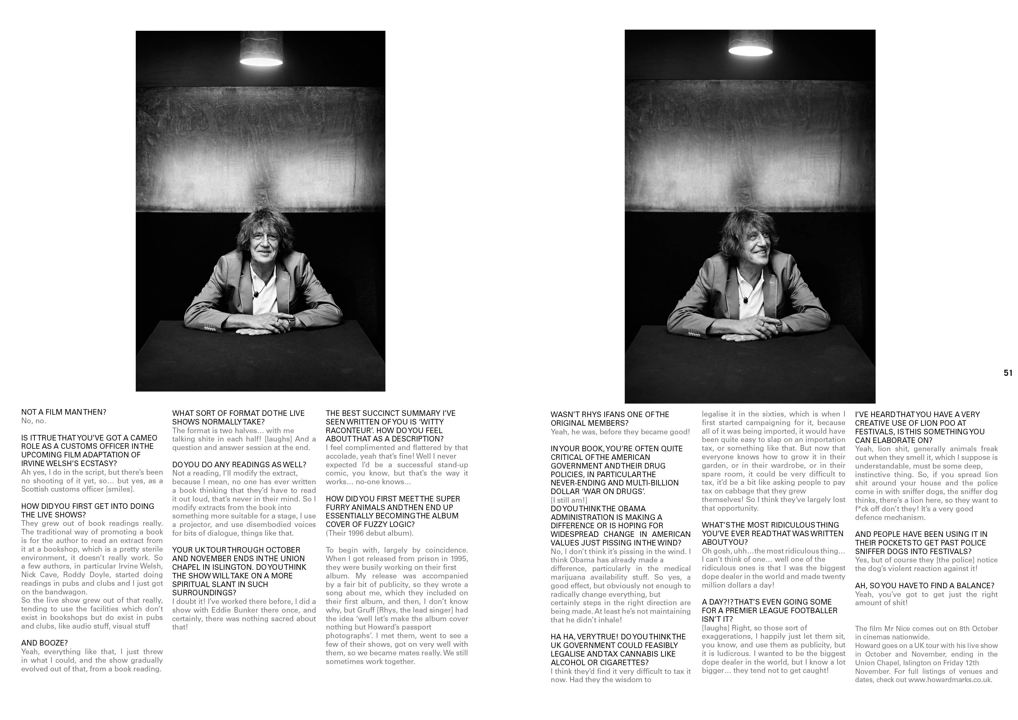 For the October 2010 issue of Who’s Jack magazine, I interviewed Howard Marks to tie-in with the upcoming biopic of his life, Mr Nice. The interview took place in Soho Theatre, Dean Street, and I took along photographer Kristoffer Myhre to get some great images too.